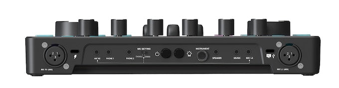 Commander M1 audio interface has two XLR mic ports for the 48V condenser microphone, and two 3.5mm mic ports for the 5V condenser microphones and dynamic microphones. With the switch, ‘MIC SETTING’, you can change the port type to condenser microphones or dynamic microphones. There are two 3.5mm audio in/out ports for your phone, one port for speakers and two ports for headphones. There is also a 6.35mm TRS port for instruments. You can connect e-piano, bass, e-guitar or other e-instruments to your M1. It supports wireless input (Bluetooth) and MUSIC ports for wired music input.